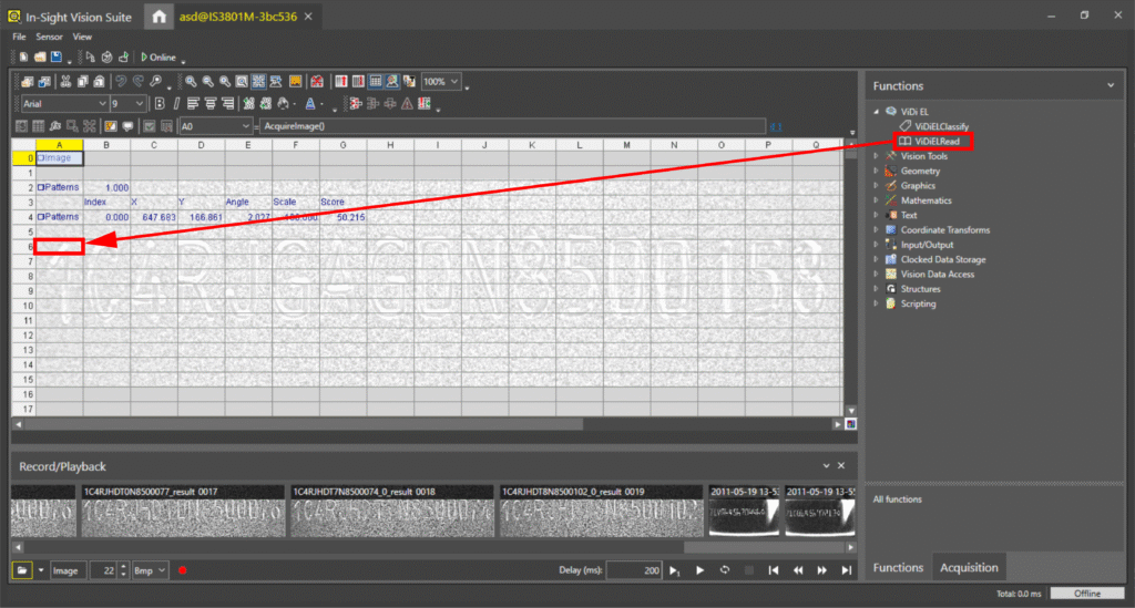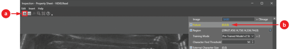 Dodanie narzędzia: Przeciągnij funkcję ViDiELRead z paska narzędzi In-Sight Toolbox do arkusza. Automatycznie otworzy się arkusz właściwości (Property Sheet).