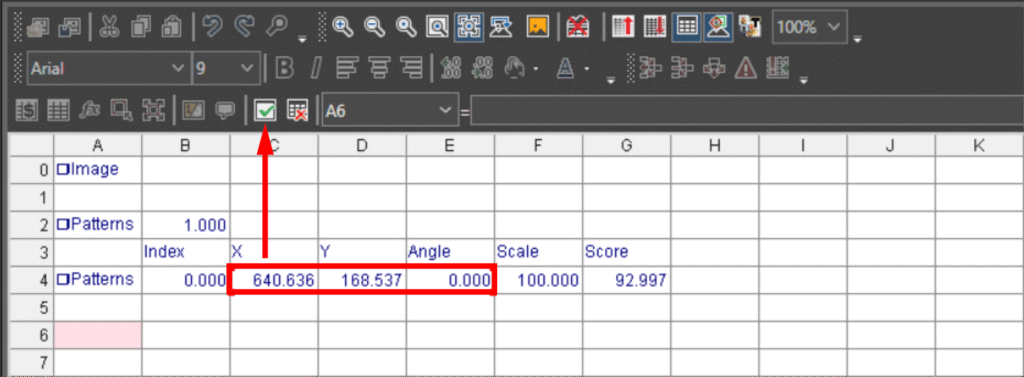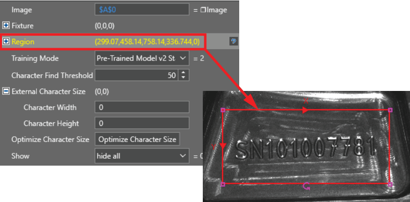 Ustawienie regionu i zakotwiczenia: Zdefiniuj parametr Region (obszar poszukiwania tekstu). Możesz go powiązać z funkcją lokalizowania (np. PatMax RedLine), podając odniesienie do komórki z wynikami Fixture, co zapewni stabilność odczytu przy przemieszczaniu się produktu.