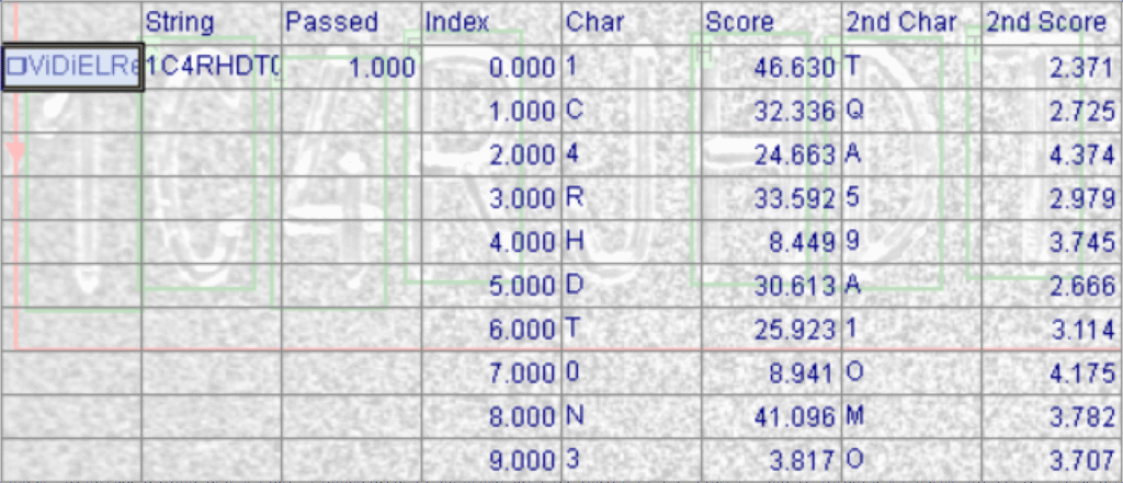Analiza wyników: Po zatwierdzeniu, funkcja zwraca w arkuszu nie tylko odczytany ciąg znaków (String), ale także szczegółowe dane dla każdego znaku, takie jak wynik pewności (Score) oraz alternatywne dopasowania, co pozwala na budowanie zaawansowanej logiki decyzyjnej.